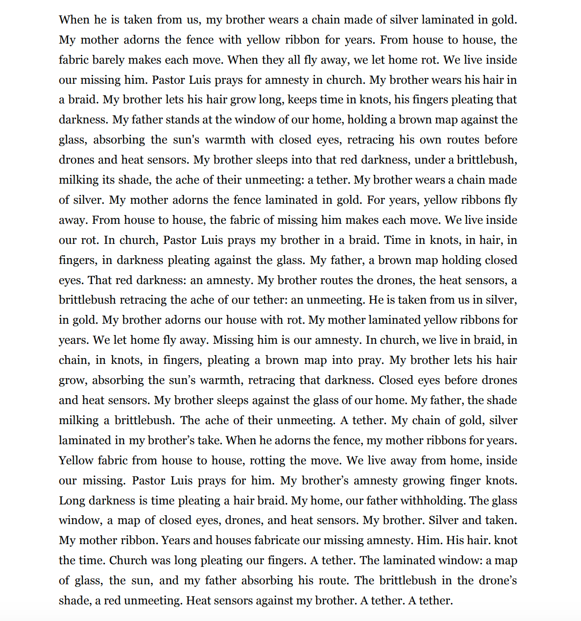 In “Poem Wedged into the Brittlebush or Poem that Eats What Happened,” Anna Flores captures the unrelenting pain and absence that continue to haunt a family after loss. The poem reveals the slow deterioration of heart and mind as a mother and father come undone, their lives unraveling around what is missing. What remains are objects—a yellow ribbon, a long braid, a silver chain, a brown map—that serve as fragments of a once-whole life, each tethered inextricably to the lost brother. Flores’s craft lies in how she uses language to embody grief: the family “[lives] inside missing him,” and as the poem progresses, complete sentences and memories collapse into single images. Through this fragmentation, Flores invites readers to inhabit the poem’s grief themselves, to feel how loss reduces language, memory, and even identity to what can barely be held onto.