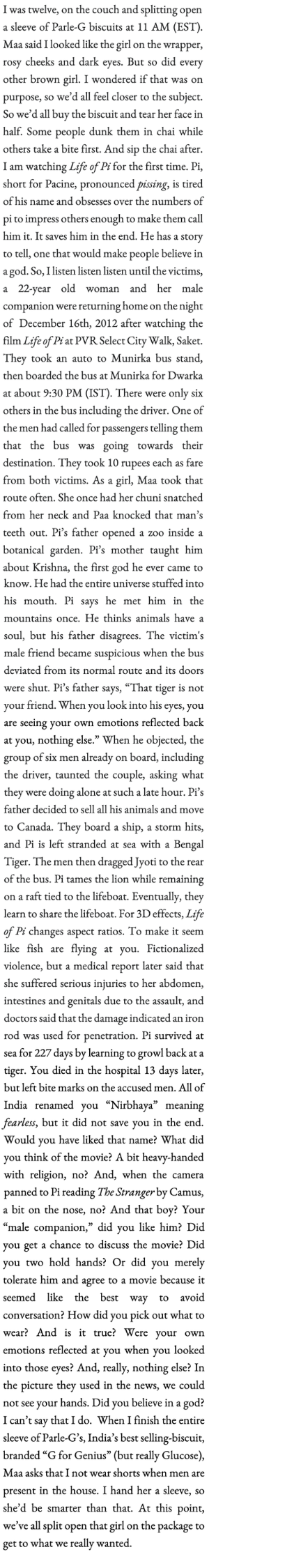 Palavi Ahuja’s poem is about far more than “a sleeve of Parle-G biscuits,” although it’s a thoroughly intriguing place to begin the careful weaving the poem accomplishes. The poem’s strands include the watching and relaying the narrative of the movie Life of Pi in fragments, snippets of conversation between the speaker and her mother, and the story of the murder of a young woman by six men in New Delhi. Meanwhile, between and among these strands, Ahuja considers what makes people believe or not believe there is a god, asking Jyoti, the young woman, if she did. Through a single column of flowing text, Ahuja brings us full circle by the end of the poem, back to the packet of biscuits where we began, mimicking the cycle of continued violence toward women.